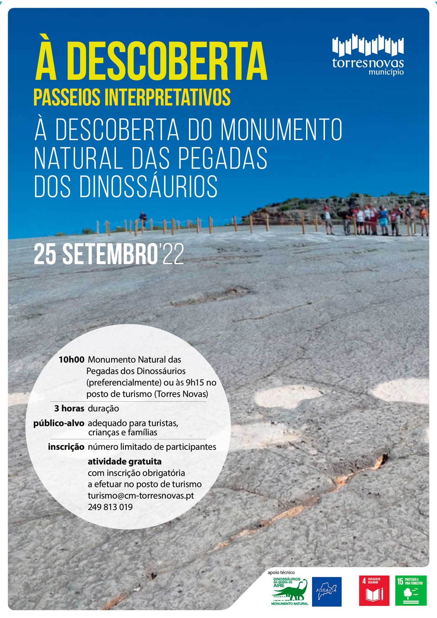 O Município de Torres Novas, com apoio técnico da ADSAICA – Associação de Desenvolvimento das Serras de Aire e Candeeiros, promove, no próximo dia 25 de setembro, um passeio interpretativo no Monumento Natural das Pegadas de Dinossáurios, com o objetivo de que os participantes partam à descoberta do património natural e turístico do concelho de Torres Novas.