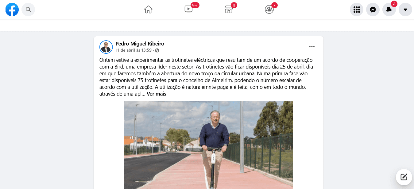 “Estive a experimentar as trotinetes eléctricas que resultam de um acordo de cooperação com a Bird, uma empresa líder neste setor. As trotinetes vão ficar disponíveis dia 25 de abril, dia em que faremos também a abertura do novo troço da circular urbana. Numa primeira fase vão estar disponíveis 75 trotinetes para o concelho de Almeirim, podendo o número escalar de acordo com a utilização.