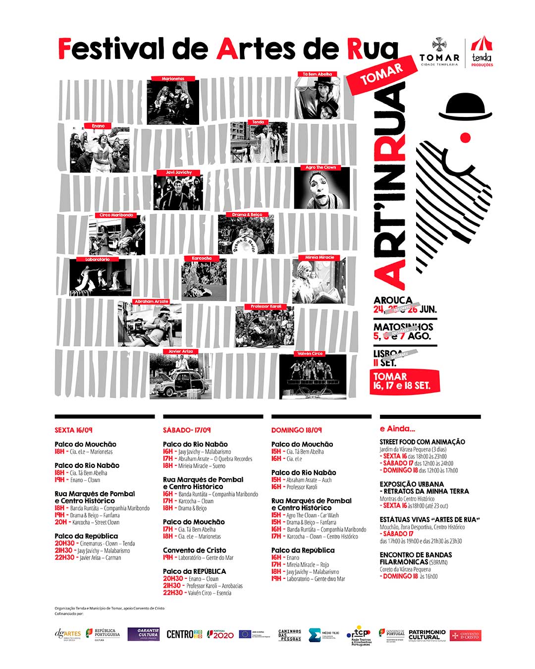 A iniciativa começa na sexta-feira, dia 16 de setembro, pelas 18 horas, com três espetáculos em simultâneo: as marionetas da companhia eLe no palco do Mouchão, os tomarenses Tá Bem Abelha no palco do rio Nabão (segue-se o palhaço Enano às 19 horas) e a música da banda Runtáta ecoando pela Rua Marquês de Pombal e centro histórico, que serão depois percorridas por Drama & Beiço (19h00) e Karkocha (20h00). Também a Praça da República terá um palco, por onde vão passar o palhaço Cinemanus (20h30), o malabarista Javy Javichy (21h30) e o carman Javier Ariza (22h30).