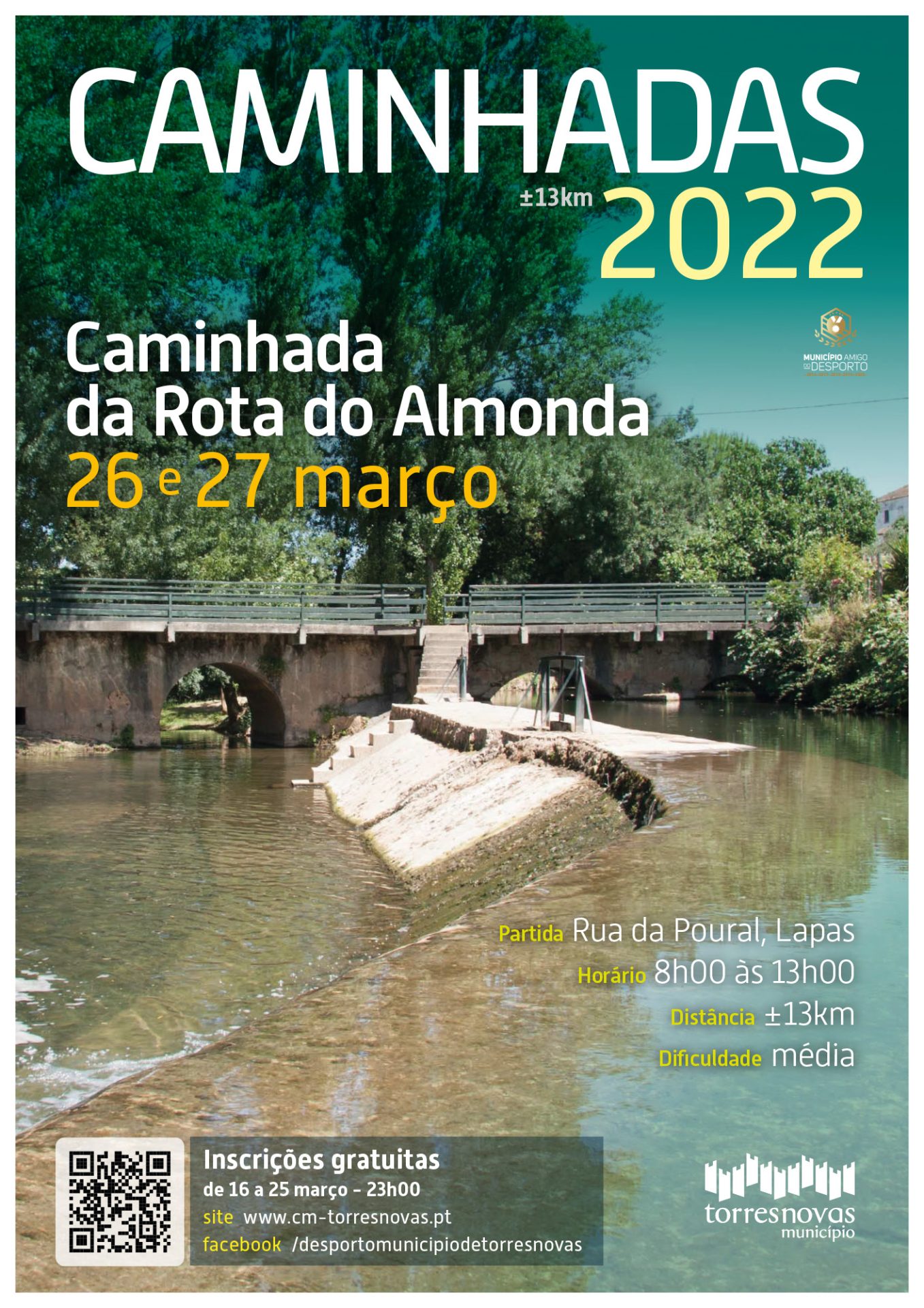 O Município de Torres Novas vai promover, nos dias 26 e 27 de março, a terceira iniciativa do projeto «Caminhadas 2022». A Caminhada da Rota do Almonda terá um percurso circular de cerca de 13km, grau de dificuldade médio, com início e fim na Rua da Poural, aldeia de Lapas. O percurso será maioritariamente ao longo das margens do rio Almonda, entre suaves elevações revestidas de olivais, figueirais e matos diversos. Uma linha de vegetação arbórea acompanha as margens, um corredor verde importante para o rio e para a sua vida selvagem.