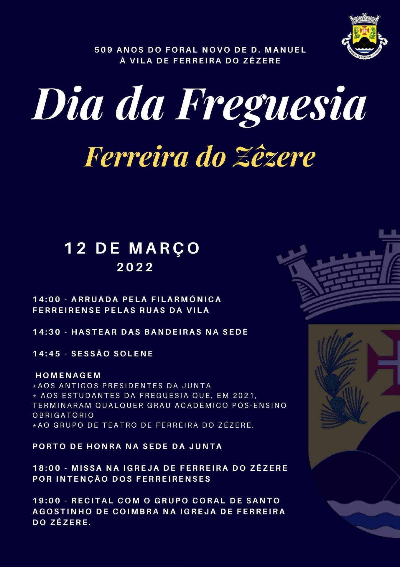 A Junta de Freguesia de Ferreira do Zêzere vai comemorar no próximo dia 12 de março, pelas 14 horas, o Dia da Freguesia que assinala os 509 anos do Foral de D. Manuel à vila de Ferreira.