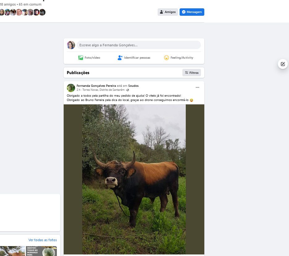 Hoje, a mesma senhora veio agradecer a todos pela partilha do seu pedido de ajuda! “O vitelo já foi encontrado! E agradece a Bruno Ferreira pela dica do local, “graças ao drone, conseguimos encontrá-lo”.