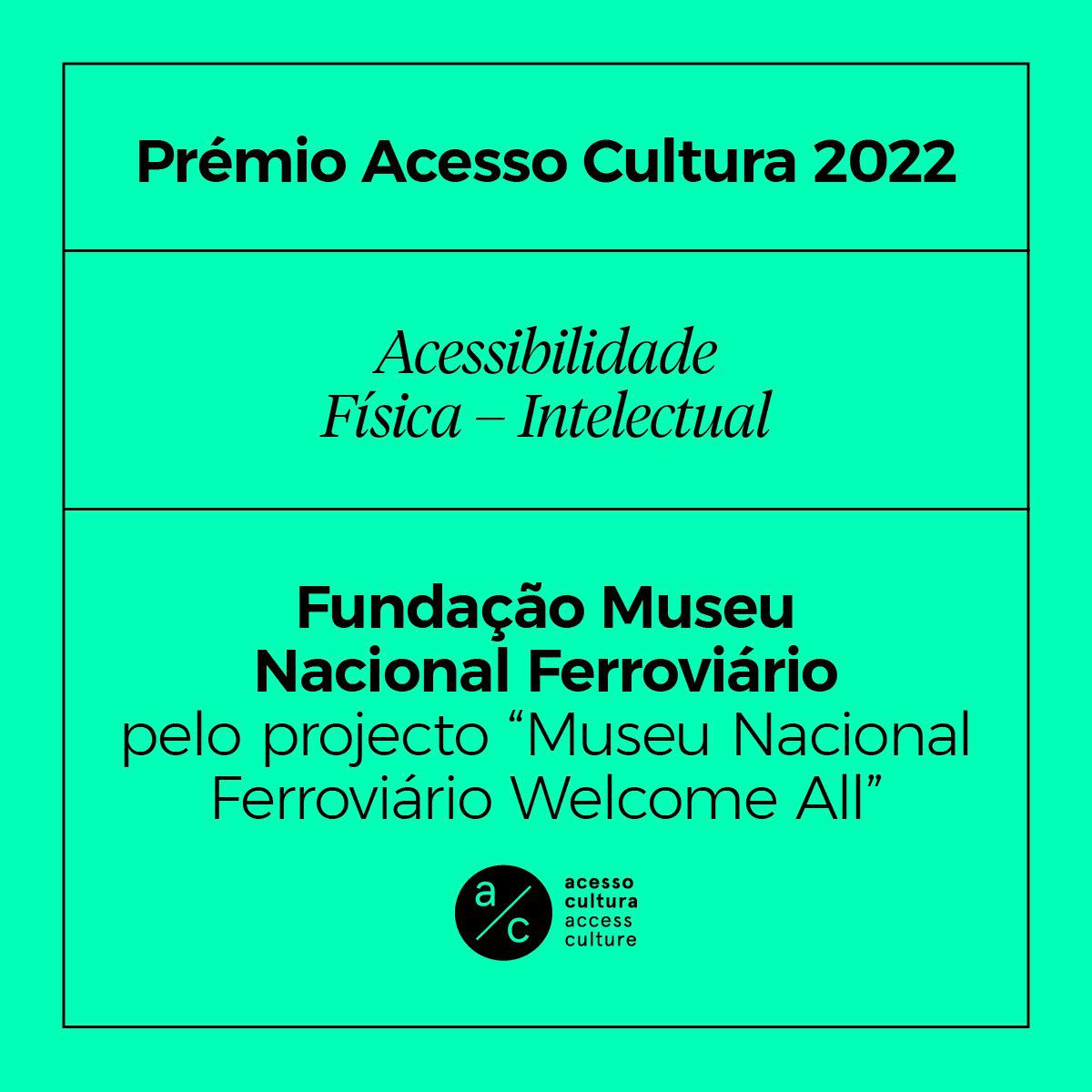 Esta distinção vem reconhecer e destacar o esforço de toda a equipa, parafraseando o Júri da Acesso Cultura : “Ao premiar o Museu Nacional Ferroviário, pretendemos valorizar e realçar o empenho e esforço da gestão e da equipa do museu em reajustar o espaço e as condições físicas de acolhimento, tal como os meios de comunicação, com o seu público, valorizando a autonomia e equidade no reconhecimento e integração da diferença.”