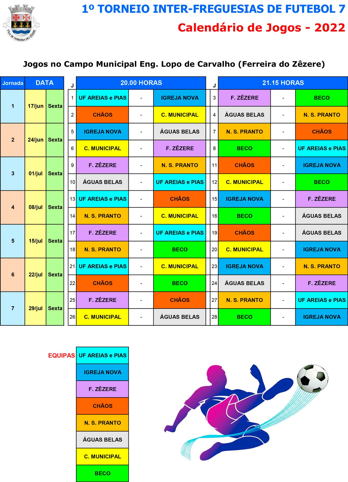 Os Jogos Os jogos ocorrerão às sextas-feiras no Campo Municipal Eng. Lopo de Carvalho, em Ferreira do Zêzere, realizando-se 4 jogos por sexta-feira (2 jogos em simultâneo, às 20h00 e 21h15).