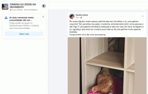 De acordo com a publicação que postou na página FERREIRA DO ZÊZERE EM MOVIMENTO, questiona: “Por acaso alguém ontem passou pela Estrada dos Carvalhais e viu uma galinha coquicha? Tem peninhas nas patas, é castanha, extremamente dócil, vai às pessoas e não foge. É uma galinha doméstica habituada a estar em casa. Por favor se alguém a viu, agradeço que entre em contacto pois trata-se de uma galinha muito especial. Gratidão. Comprometo-me a dar uma recompensa”.