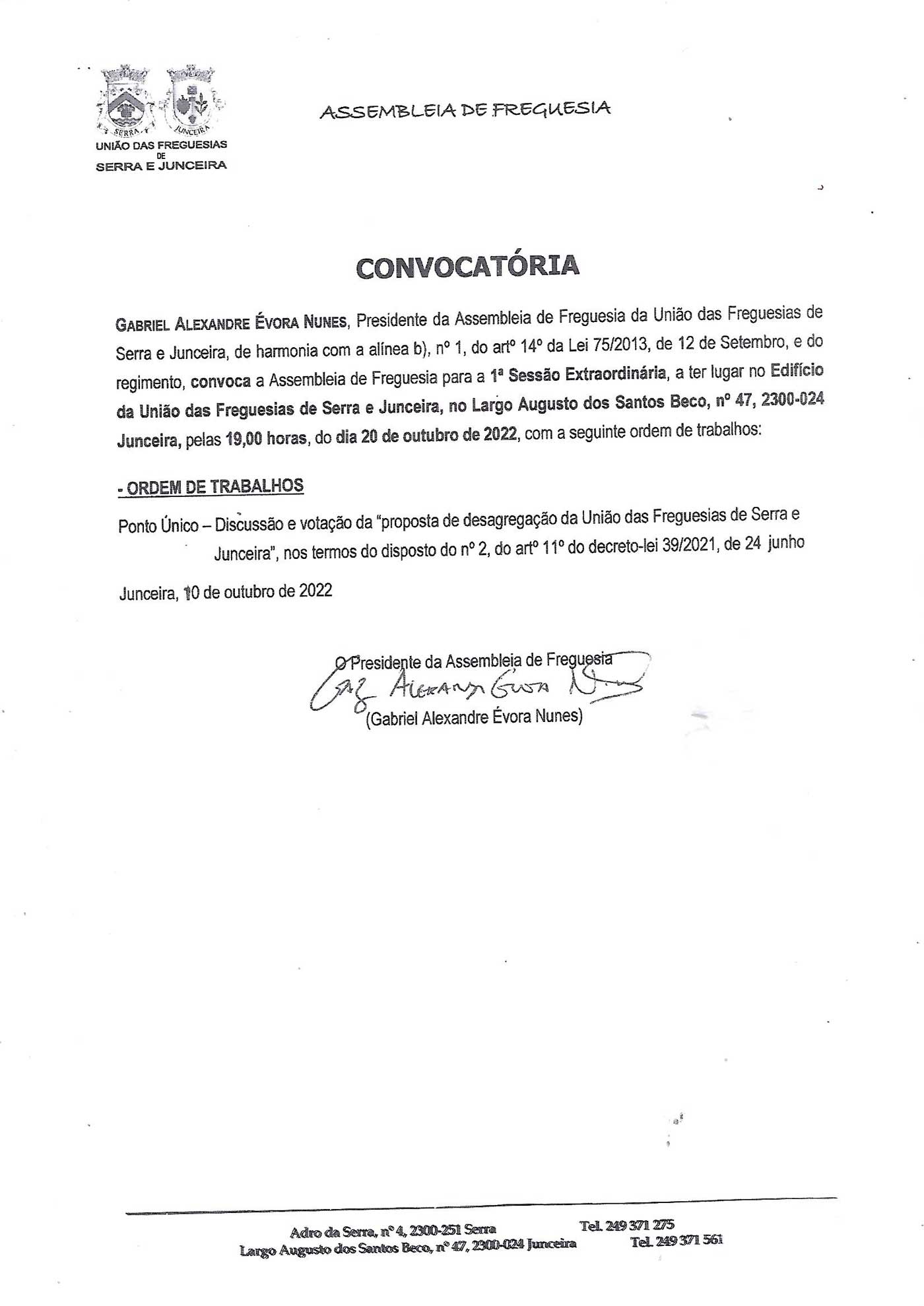 Já foi convocada a sessão da Assembleia de Freguesia da União de Freguesias de Serra e Junceira para deliberar sobre a desagregação desta união de freguesias. Foi marcada para a próxima quinta-feira, dia 20, pelas 19h00.