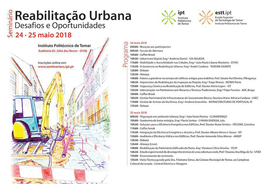 Decorre nos próximos dias 24 e 25 de maio, pelas 9.30h, no auditório Dr. Júlio das Neves – O106, no campus do Instituto Politécnico de Tomar (IPT), o Seminário Reabilitação Urbana – Desafios e Oportunidades, promovido pelo Curso de Mestrado em Reabilitação Urbana da Escola Superior de Tecnologia do IPT.